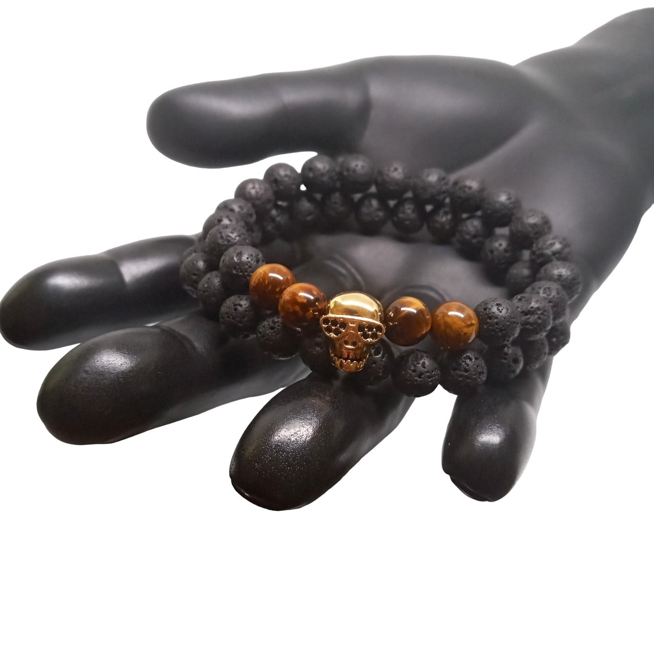 Juego de Pulsera para Hombre de Calavera con Piedra Volcánica y Ojo de Tigre