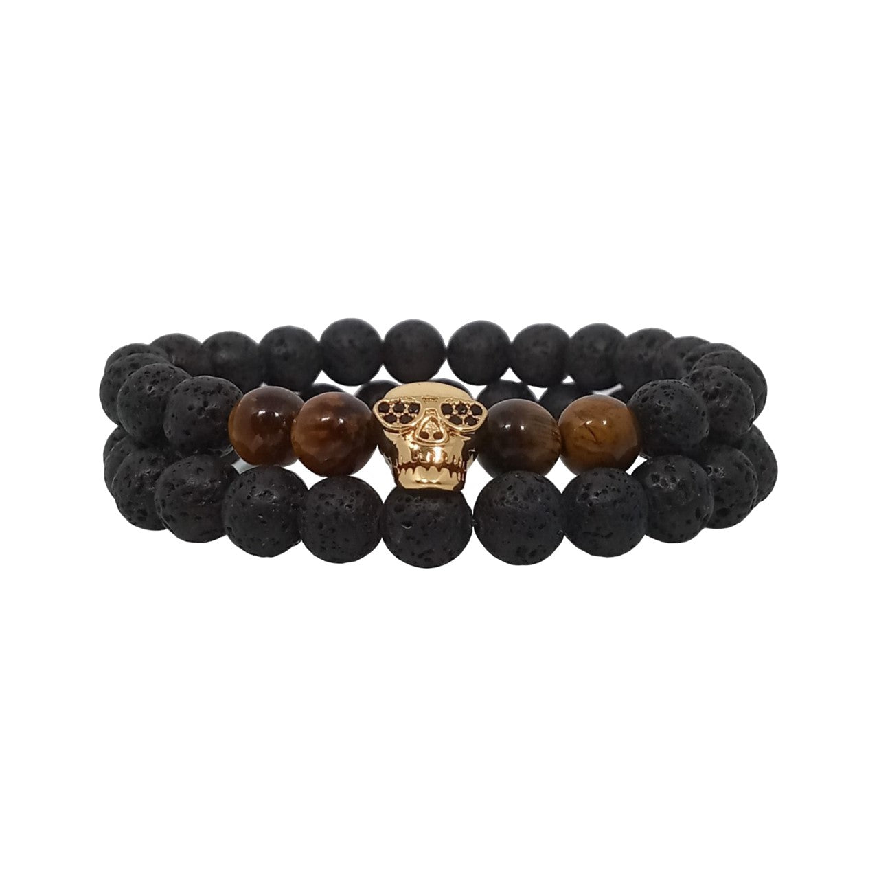 Eleva tu presencia con nuestro Juego de Pulsera diseñado para el hombre moderno y audaz. Esta pieza única combina la energía y resistencia de la Piedra Volcánica o de Lava, la protección y confianza del Ojo de Tigre y un dije de cabeza de calavera que refleja un toque rebelde y sofisticado, creando un accesorio único que no pasa desapercibido. Puede usarse en conjunto o por separado.