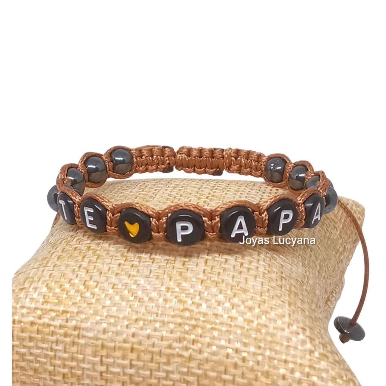 Pulseras para hombre con la frase "Te Amo Papá" elaborada con piedra de Hematita que aporta equilibrio, fuerza y protección, Ojo de Tigre marrón que fomenta la confianza y valentía, e hilo. Perfecta para honrar a todo padre en su día, o en una ocasión especial, combinando estilo y significado.