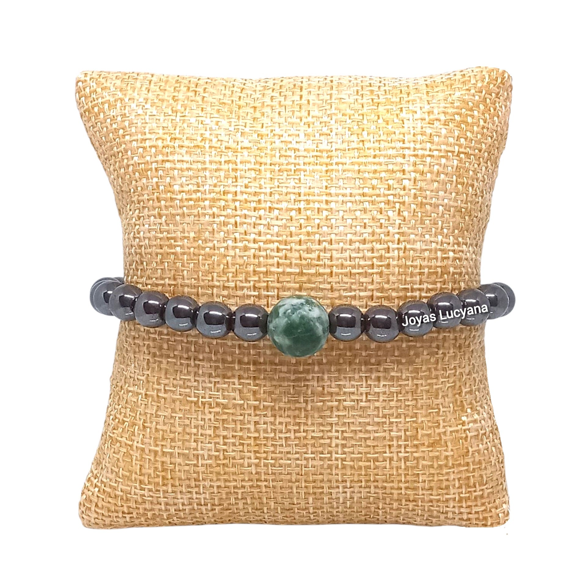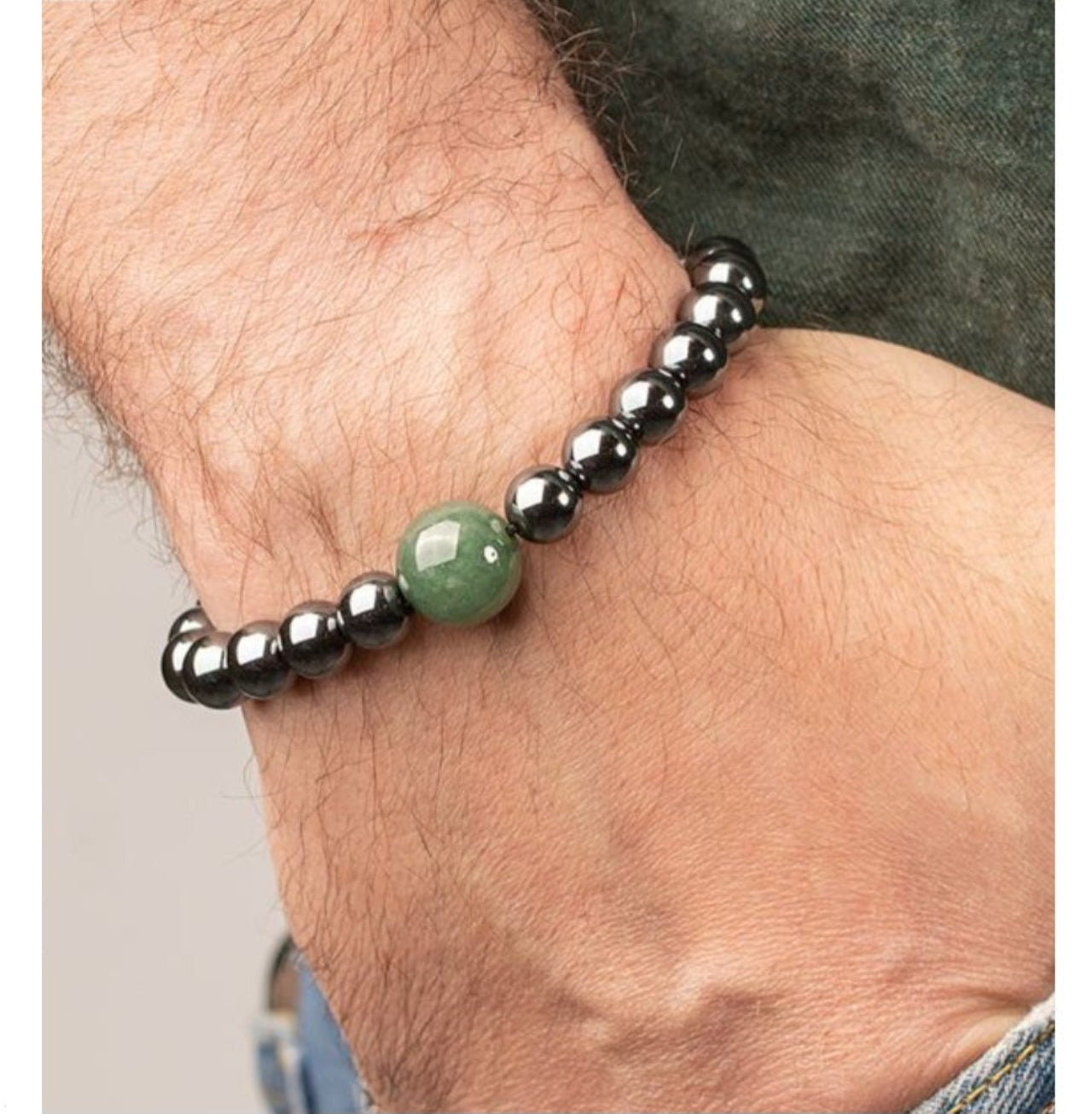 Eleva tu estilo con nuestra pulsera para hombre de piedras naturales, diseñada para el hombre moderno que busca elegancia y energía. Cada cuenta de Hematita irradia un brillo magnético que combina sofisticación y poder, sumado con el Ojo de Tigre, Aventurina y Jaspe verde que brindan protección energética, fuerza y armonía.