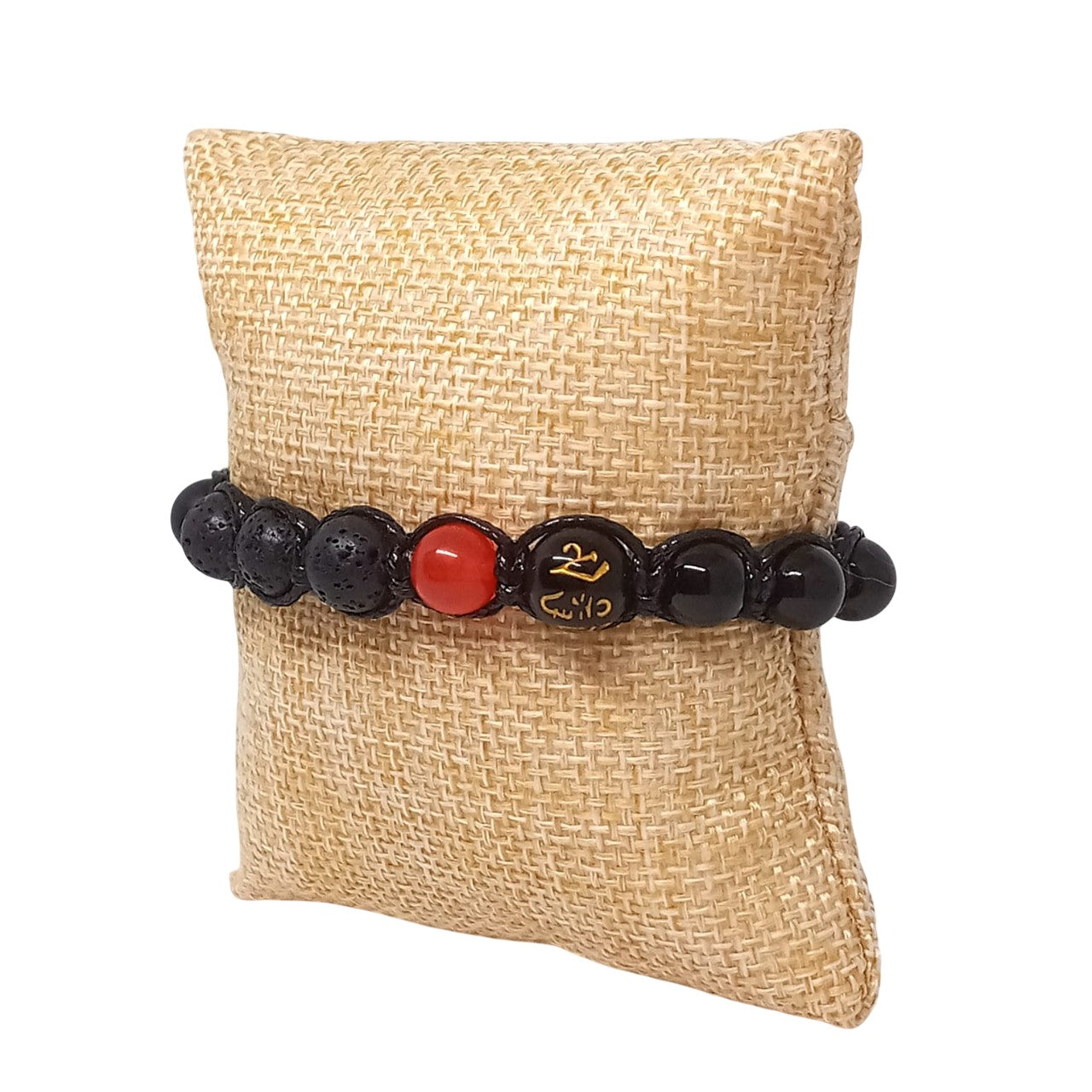 Esta pulsera para hombre combina piedras naturales de ónix, volcánica y cornalina roja con una cuenta de mantra Om Mani Padme Hum, diseñada para atraer energía positiva y equilibrio a tu vida. Más que un accesorio, es un símbolo de protección y bienestar que puedes llevar contigo todos los días.